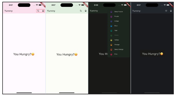 Cari // Manual theme toggle lalu ubah light menjadi dark untuk melihat variasi temanya. Pastikan untuk melakukan hot restart.