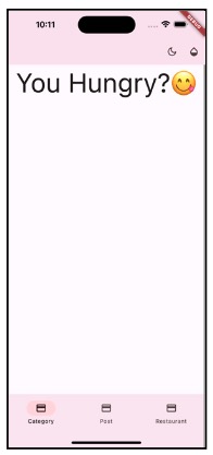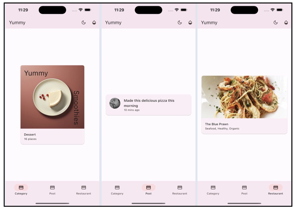 Di akhir bab, kamu akan membangun sebuah aplikasi sosial bertema makanan bernama Yummy. Kamu akan menggunakan berbagai widget untuk membuat tiga tab yang berbeda: Category, Post, dan Restaurant.