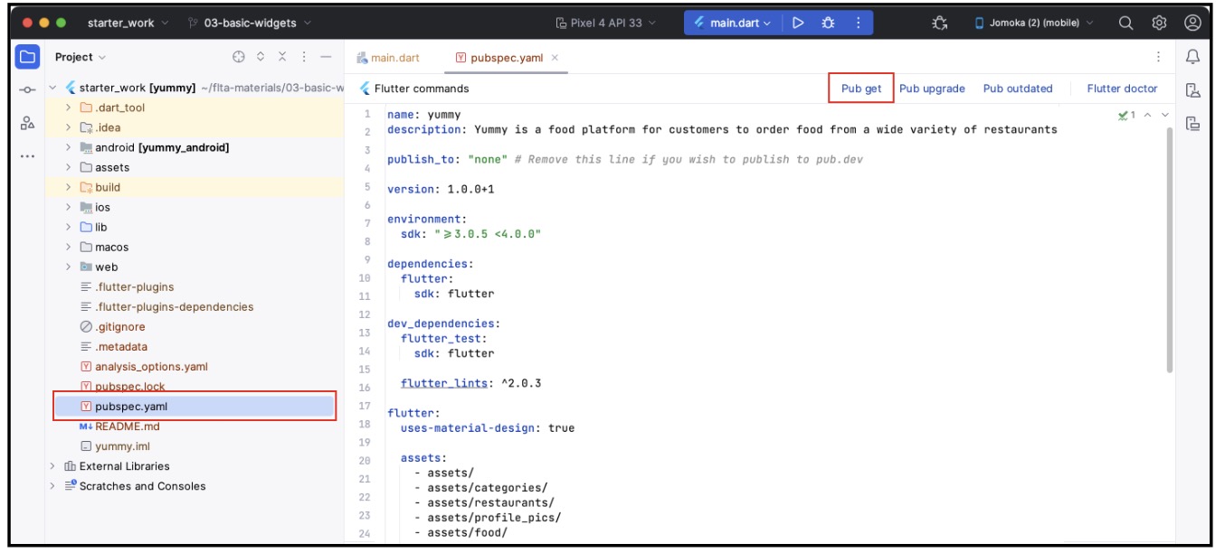 Temukan folder projects lalu buka folder starter. Setelah itu, navigasikan ke pubspec.yaml dan jalankan Pub get untuk mengambil semua dependensi Flutter yang dibutuhkan.