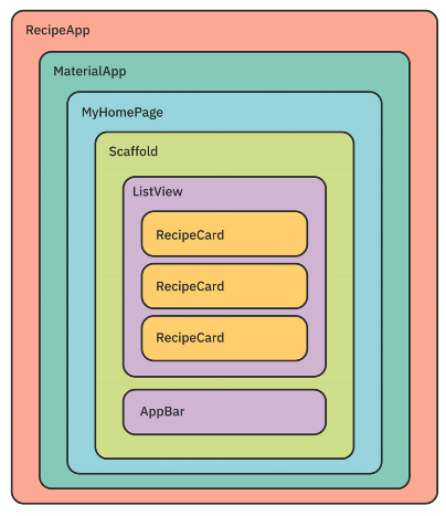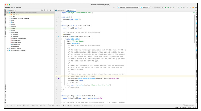 Sementara itu, runApp() memberi tahu Flutter widget tingkat teratas (top-level widget) mana yang harus dijalankan sebagai root dari aplikasi. Dalam kasus ini, widget tersebut adalah RecipesApp.