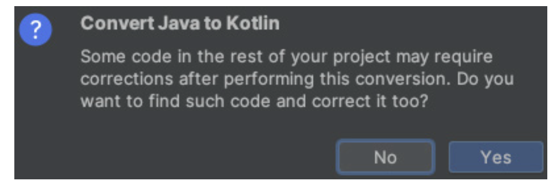 Terkadang setelah proses konversi, kamu mungkin perlu melakukan beberapa penyesuaian. Itulah alasan mengapa dialog konfirmasi ini disediakan. Klik Yes untuk melanjutkan, dan kamu akan melihat bahwa kode kamu kini telah berubah menjadi Kotlin. Fitur ini sangat membantu karena menangani sebagian besar proses konversi ke Kotlin sekaligus membantu kamu memahami sintaks Kotlin.