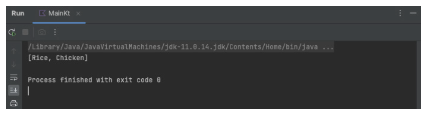 Seperti yang dapat kamu lihat pada screenshot sebelumnya, output yang dihasilkan berupa daftar bahan yang telah kamu tambahkan. Sekarang kamu bisa menyiapkan hidangan nasi dan ayam yang lezat—tentu saja, dengan Kotlin!