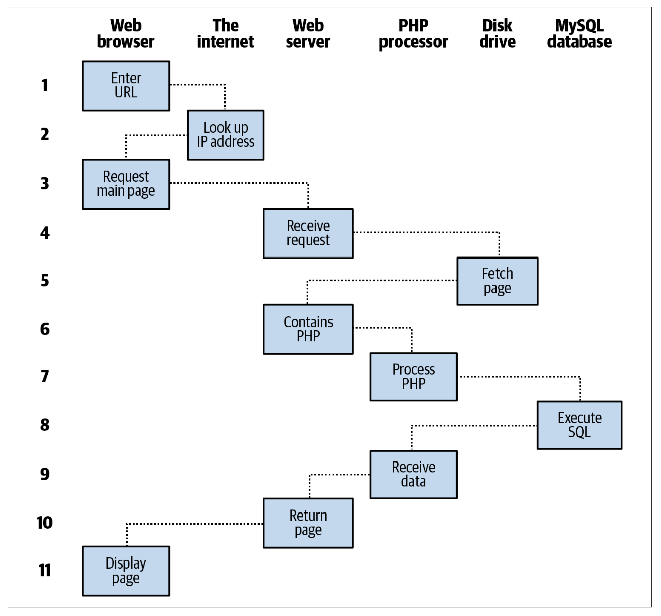 Jika berurusan dengan halaman web dinamis, urutannya menjadi sedikit lebih rumit karena melibatkan PHP dan MySQL. Misal kamu mengklik gambar jas hujan, PHP akan membuat request ke database menggunakan SQL (kamu akan mempelajari perintahnya di buku ini) dan permintaan itu dikirim ke MySQL. Hasil pencarian mengenai jas hujan tadi dikembalikan oleh MySQL, kemudian PHP membungkusnya menjadi HTML lalu dikirimkan ke browser untuk ditampilkan (lihat gambar).