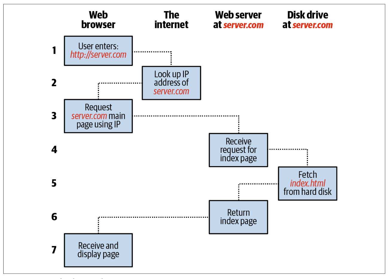 server.com. - Browser mengirim permintaan ke alamat itu agar dapat halaman utama.