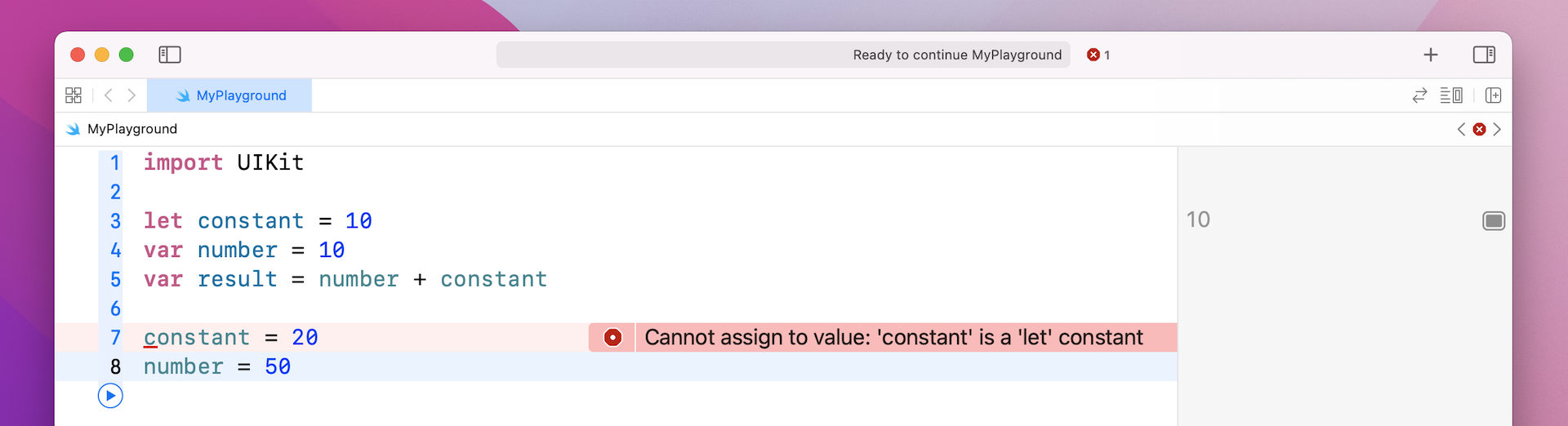 Pada contoh ini, kamu mencoba menetapkan nilai baru pada constant dan variabel. Namun, begitu kamu mengubah nilai constant, Xcode langsung menampilkan error di console. Sebaliknya, tidak ada masalah sama sekali saat nilai number diubah.