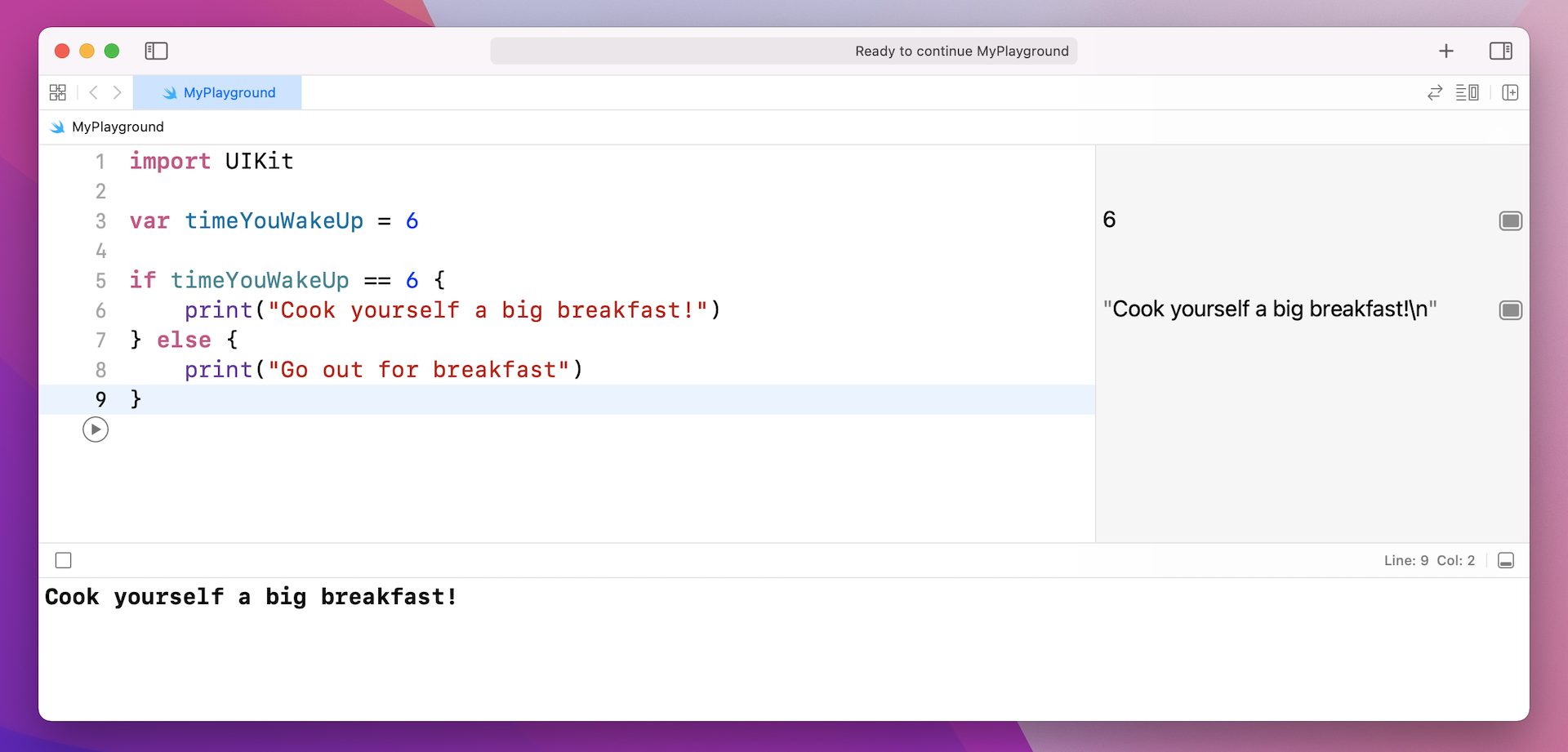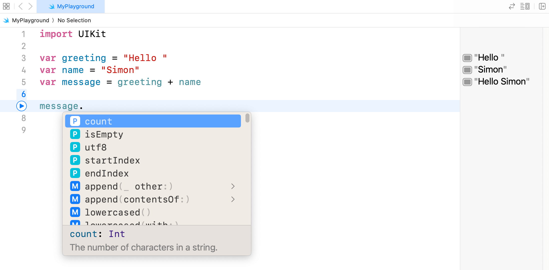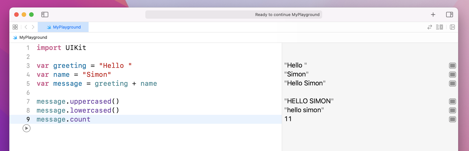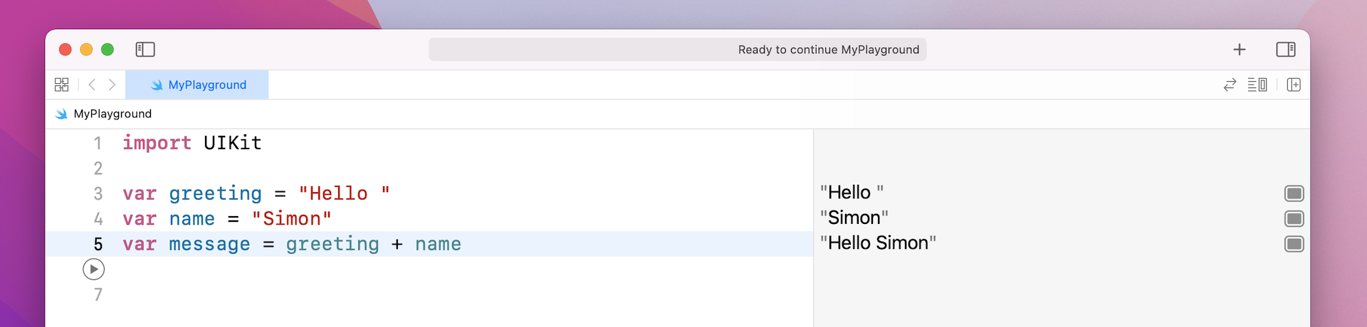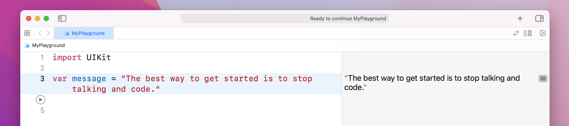 Setelah kamu mengetikkan baris kode di atas di Playgrounds dan menekan Play, hasilnya akan langsung ditampilkan di panel sebelah kanan.