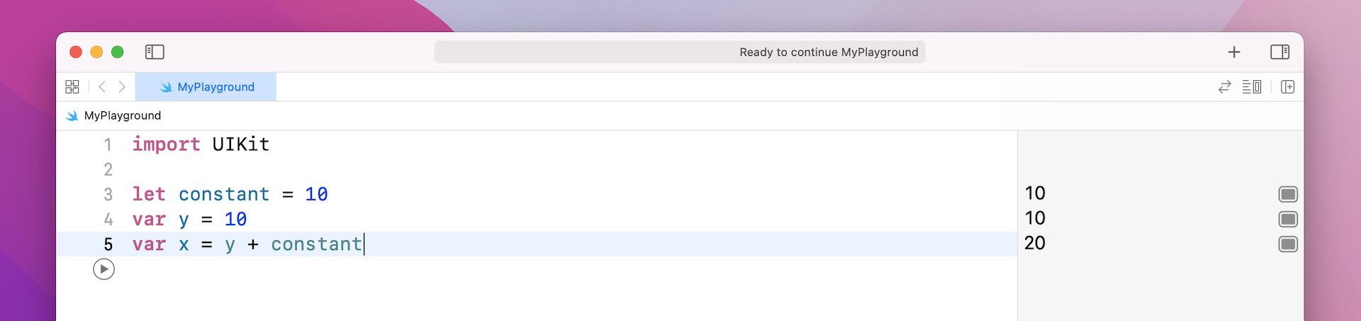 Dalam Swift, kamu mendeklarasikan variabel dengan kata kunci var, dan constant dengan kata kunci let. Jika persamaan di atas dituliskan dalam bentuk kode, hasilnya akan seperti ini: